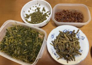 ご飯は父親お手製のワサビ菜、蕗、木の芽、ナラ漬の超ヘルシーご飯🤭